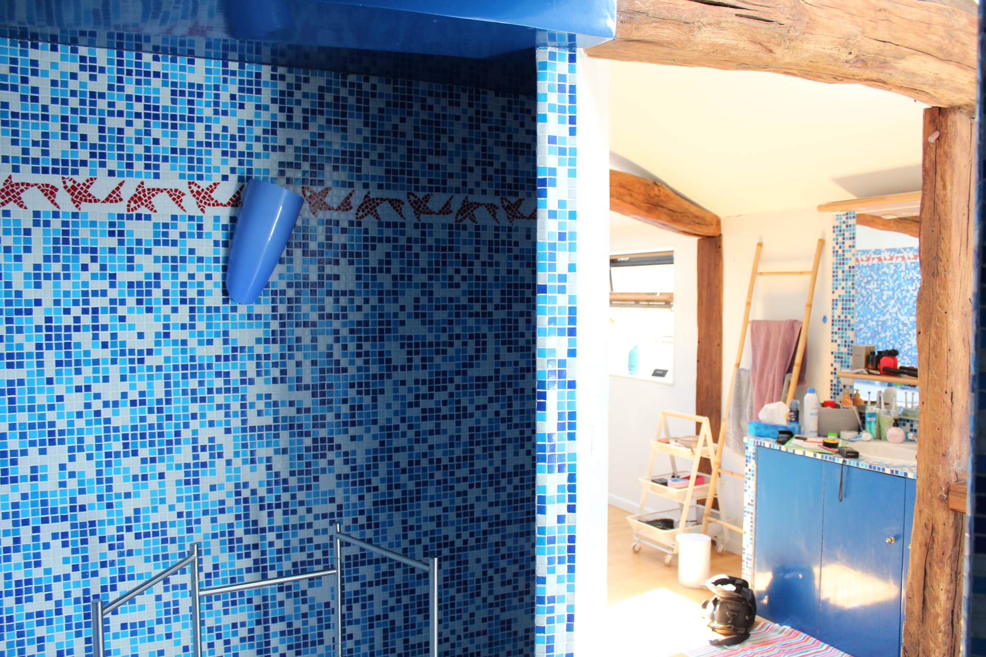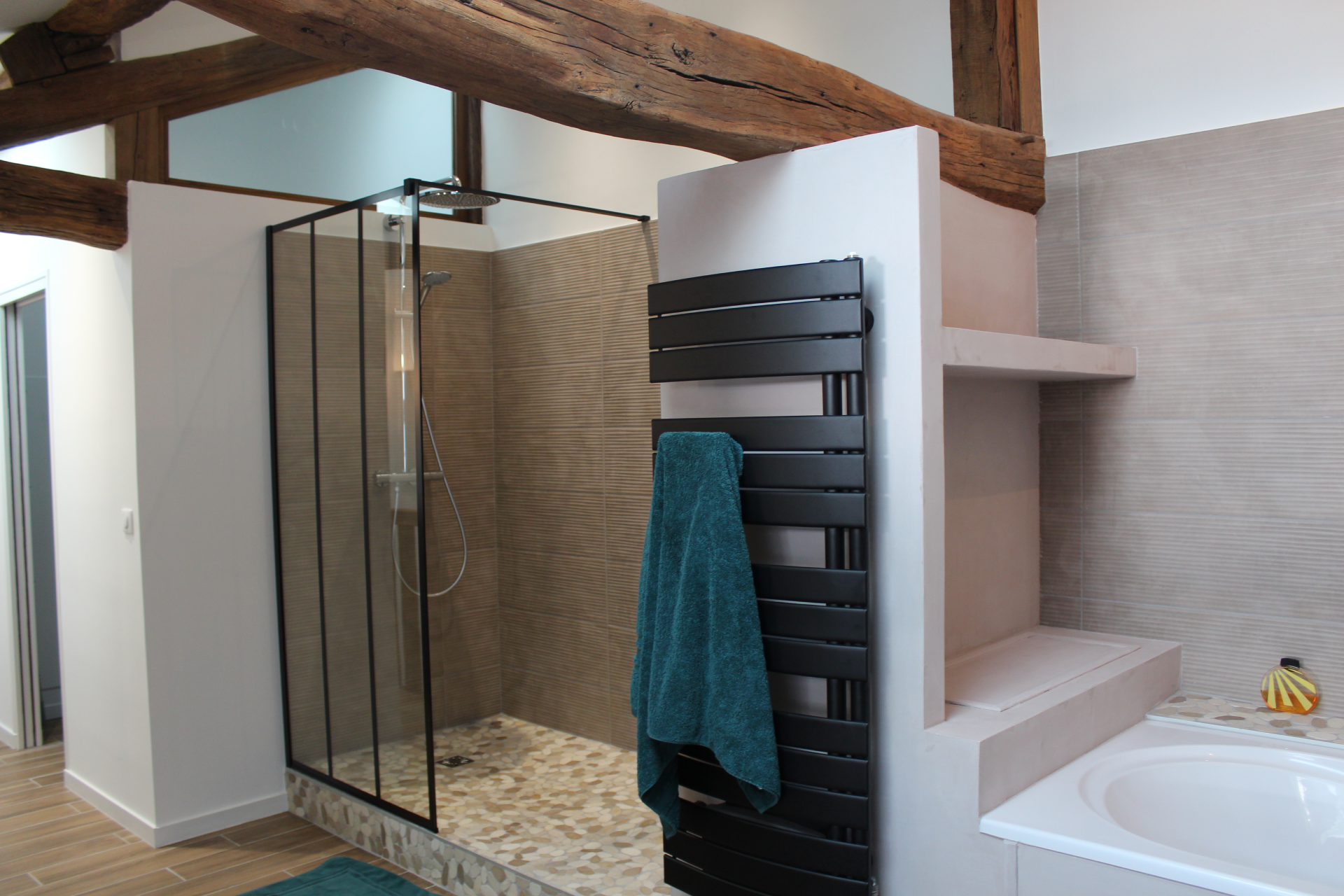 Création d'une douche XXL à côté de la baignoire balnéo conservée