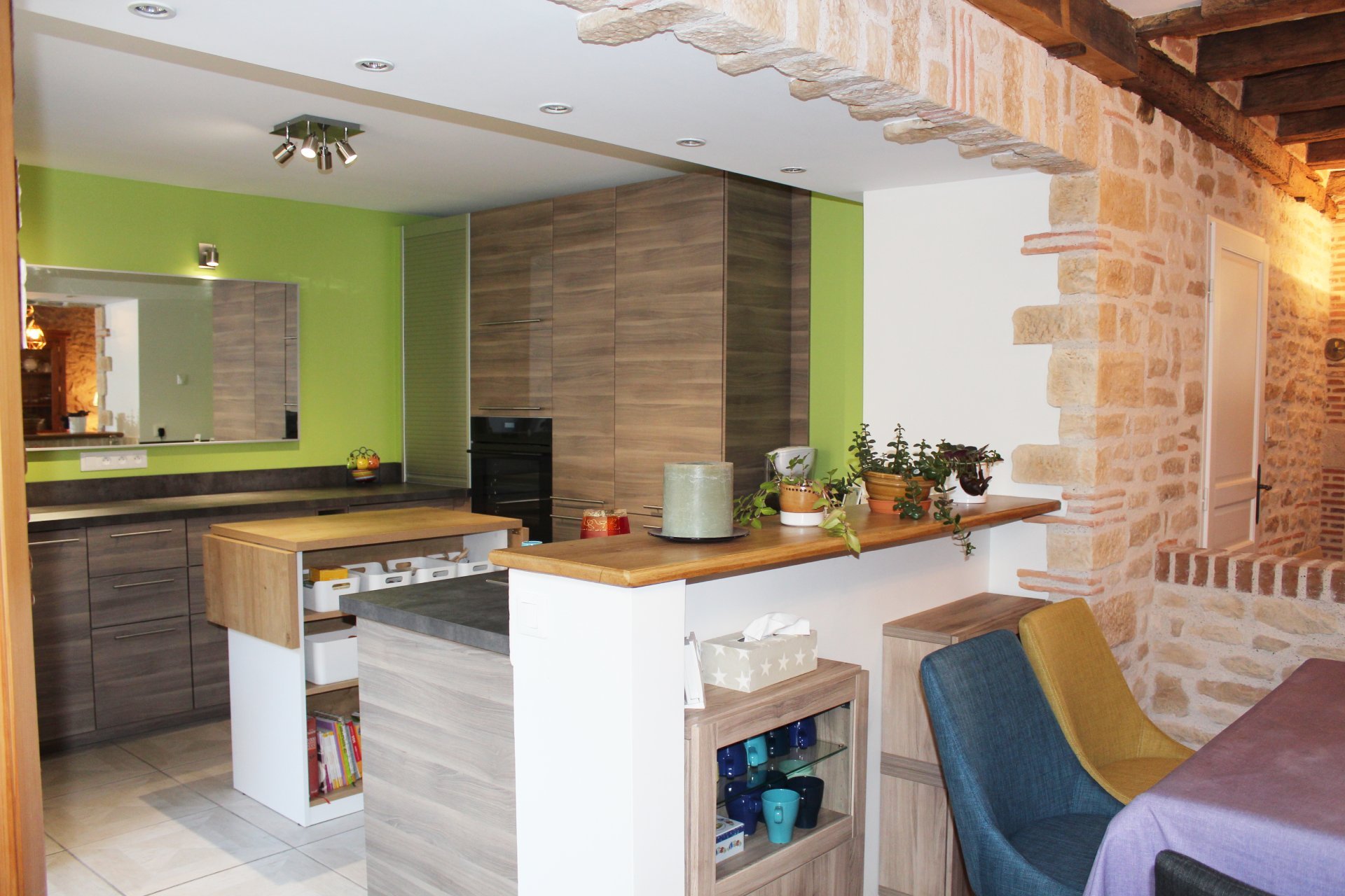 Agencement complet de la cuisine soulignée de vieilles pierres