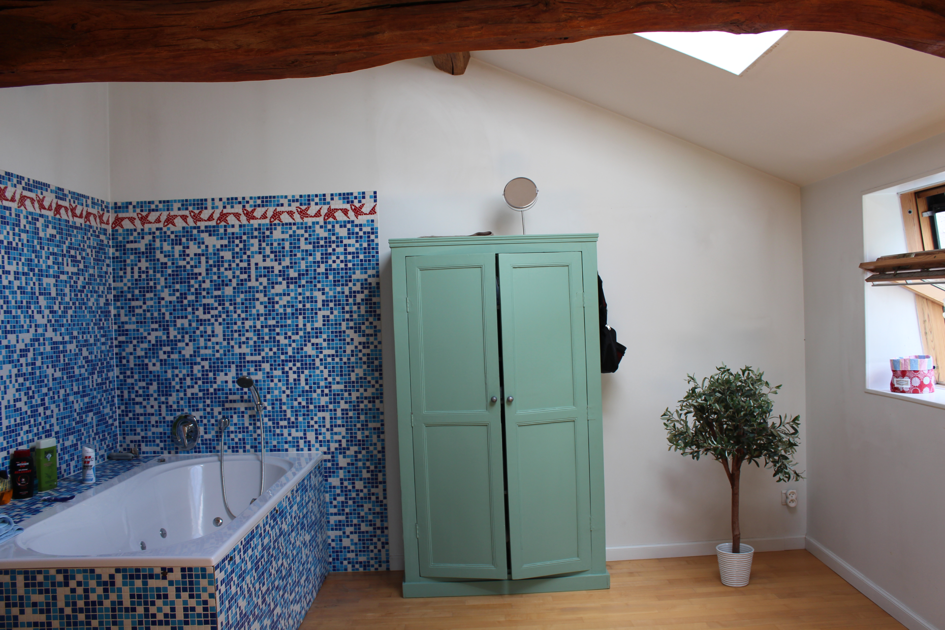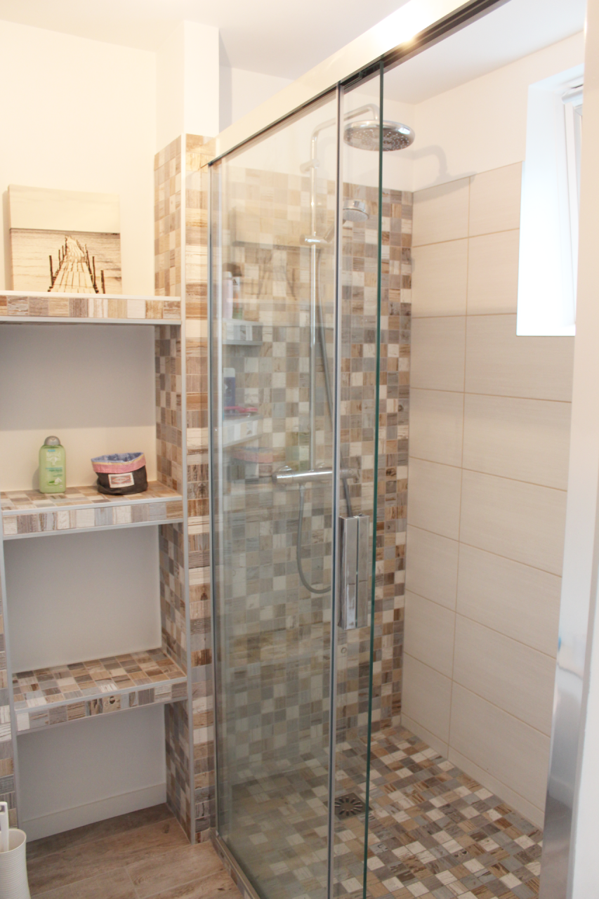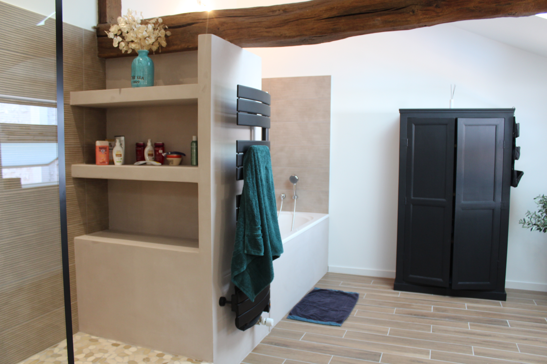 Création d'une douche XXL à côté de la baignoire balnéo conservée